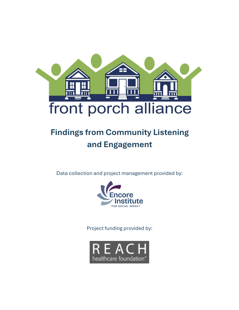 In 2023, Front Porch Alliance secured funding to conduct a Community Needs Assessment. Coming off the heels of COVID and about start strategic plans, we wanted to ensure we had feedback from the community to guide our next three to five years. With the help of The Encore Institute for Social Impact and REACH Foundation, we conducted surveys, focus groups and interviews to gather as much input as possible. With the support of Encore, REACH and Rooted Strategy, we presented the findings at a dinner in April 2024.