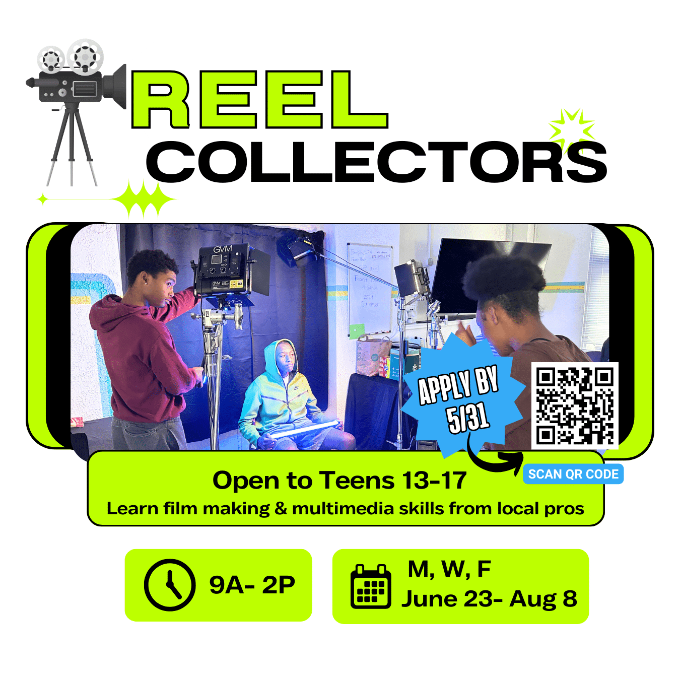 Reel Collectors provides teens with “real time” training and access to film and storytelling software and equipment. During the summer, participants will be trained in filmmaking and storytelling then use those skills to create a short documentary film.